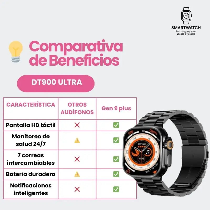 Este DT900 ULTRA te mantiene conectado con estilo y precisión, brindándote una experiencia moderna y comodidad durante todo el día.